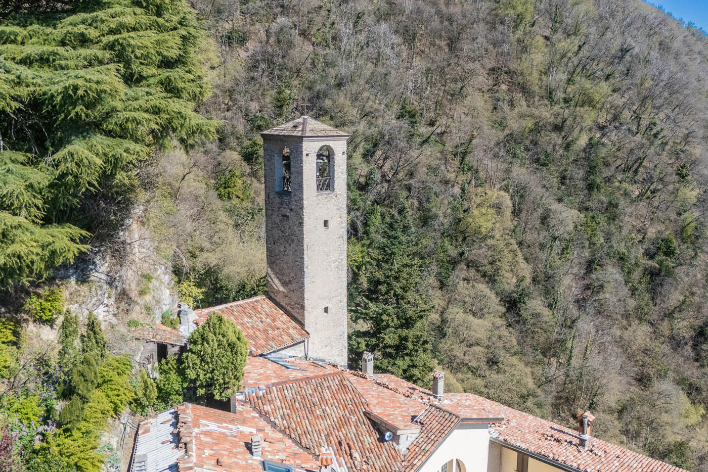 La torre, nata come struttura di segnalazione fortificata e collegata al sistema difensivo del Castello Baradello, rappresenta uno degli elementi più emblematici dell’insieme. Le facciate in pietra, le proporzioni della navata e gli affreschi conservati restituiscono un patrimonio materico e culturale di grande valore.