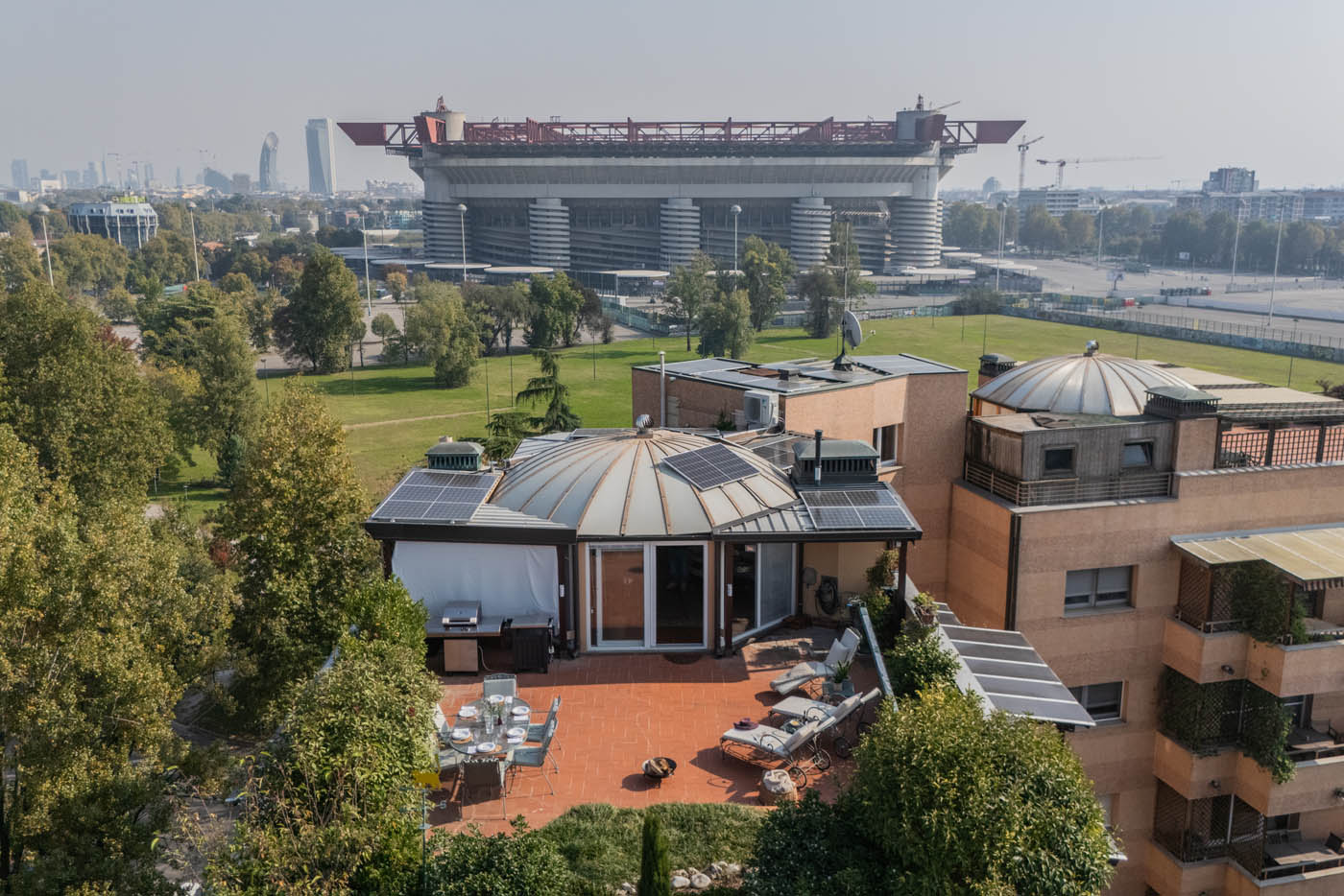 L'attico sorge nella zona più signorile e tranquilla di San Siro, tra giardini residenziali e viali alberati, a breve distanza dalle nuove Terme di Montel e dallo stadio. Un quartiere che combina privacy e servizi, il palazzo con portineria, giardino condominiale e accesso rapido al centro città. In questo contesto, Tesio Penthouse incarna la sintesi perfetta della Milano di oggi: tecnologica, raffinata e sostenibile.